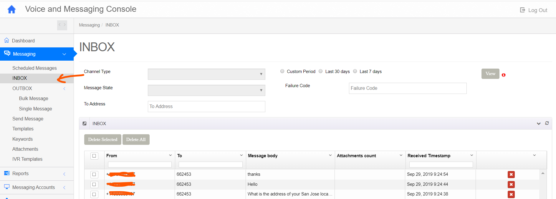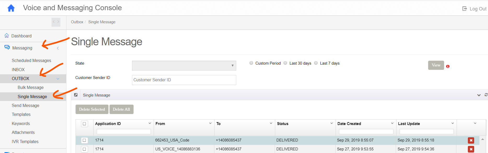 Important: To get status indication or notification of your messages, you have the option of using the "Outbox" feature in the Message console or the Event management service for API events that can be posted directly as callback to your application. For more information on using Event Manager, please checkout our knowledgebase article on setting up a webhook for receiving notifications and messages.