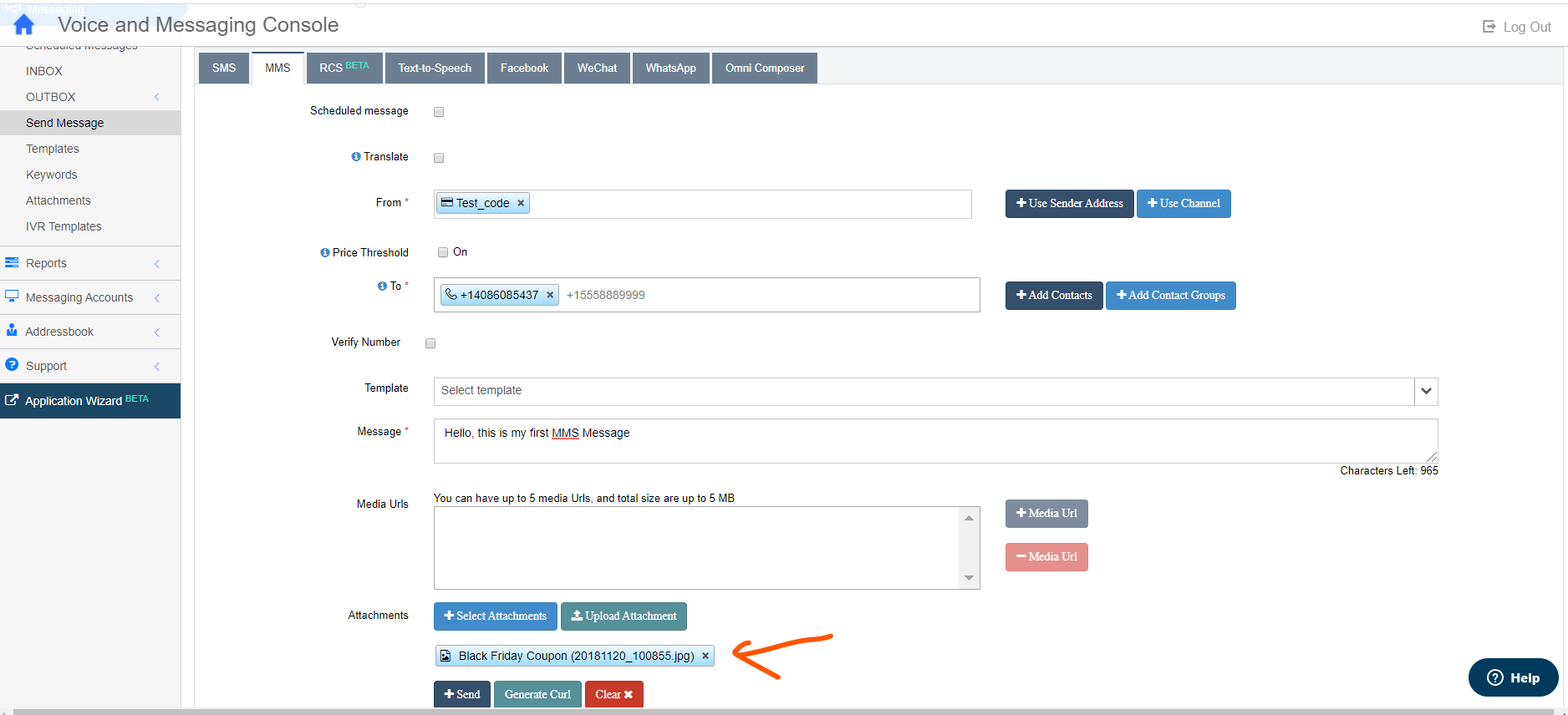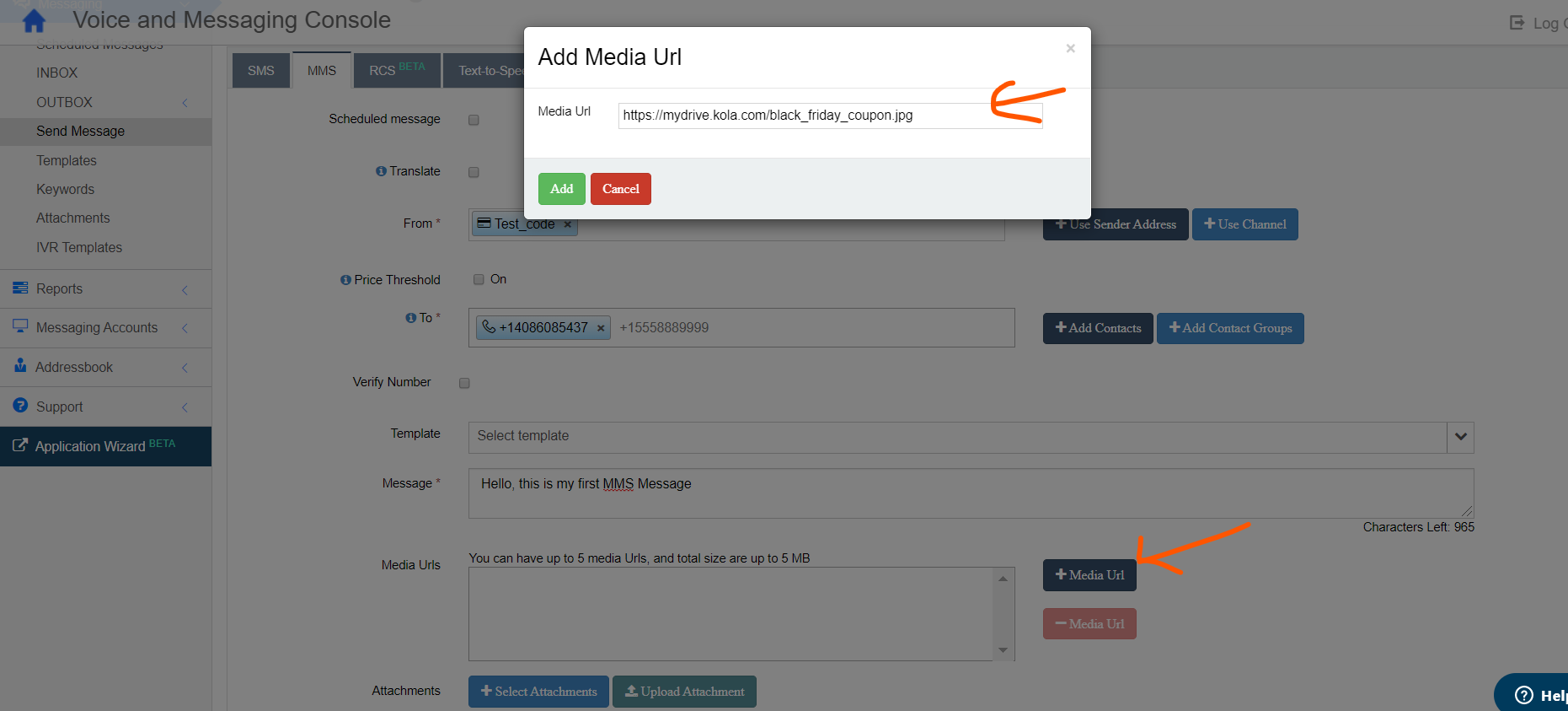- Add the link to our Content making sure its the complete url to the content. You can add upto 5 media URLs for a message. Please note that the total size of the contents in each URL cannot exceed the total size allowed for a particular message or your message will be rejected.