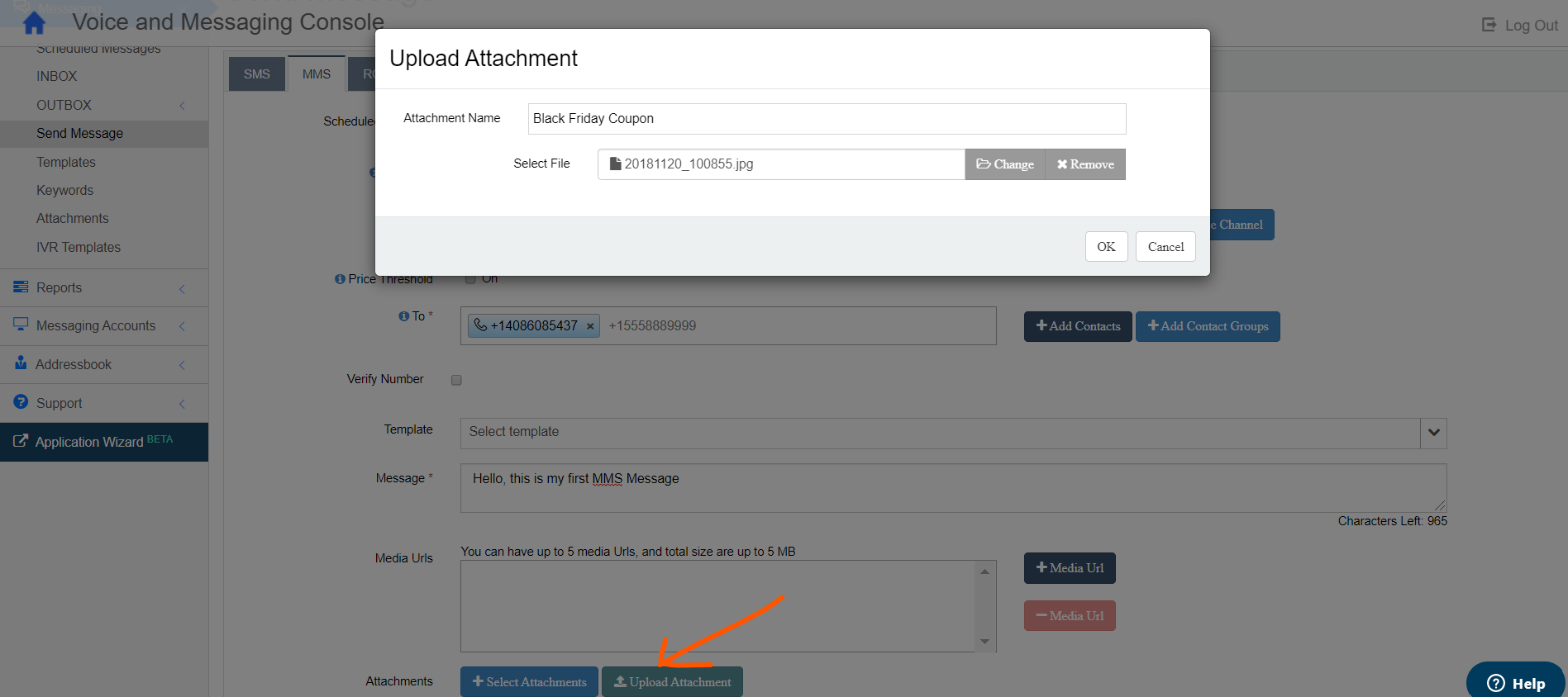 - To add your MMS payload, you can select an existing attachment by clicking the