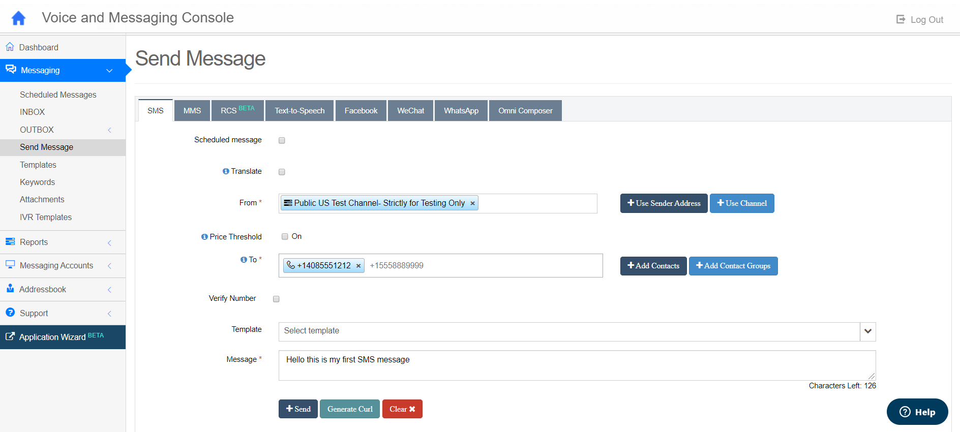 - Populate the "To" field of the Send message with the appropriate Mobile number. Bare in mind that the format for the mobile number has to be in E.164 format e.g. +14085551212)