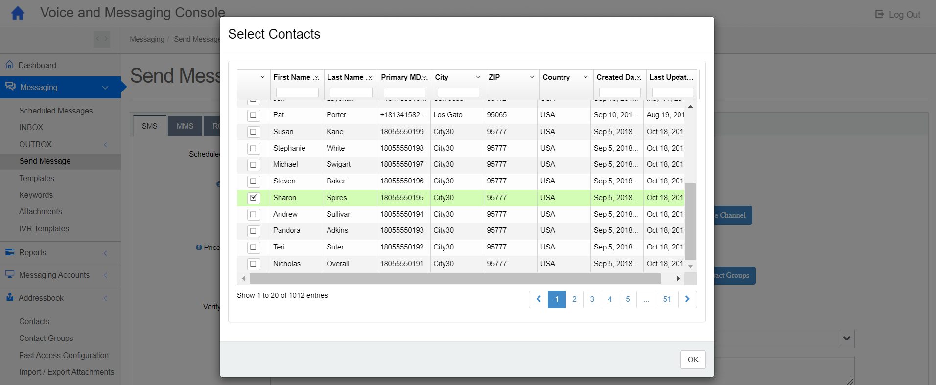 Similar to the above flow, you can send a message to a Contact. A Contact is a recipient that you have stored a recipient address for in the Syniverse Address book in the platform. For more information how to store a recipient address, please visit our knowledgebase portal.